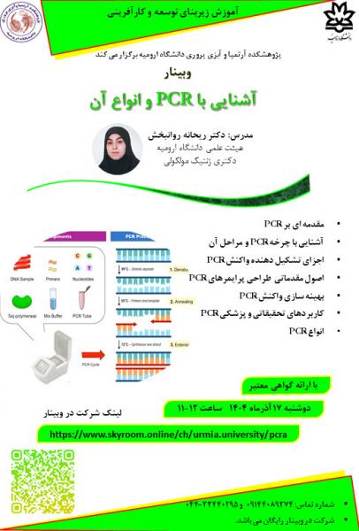 برگزاری وبینارآشنایی با PCR و انواع آن "توسط خانم دکتر ریحانه روانبخش در روز دوشنبه 17 آذرماه ساعت 12-11 گالری تصاویر: